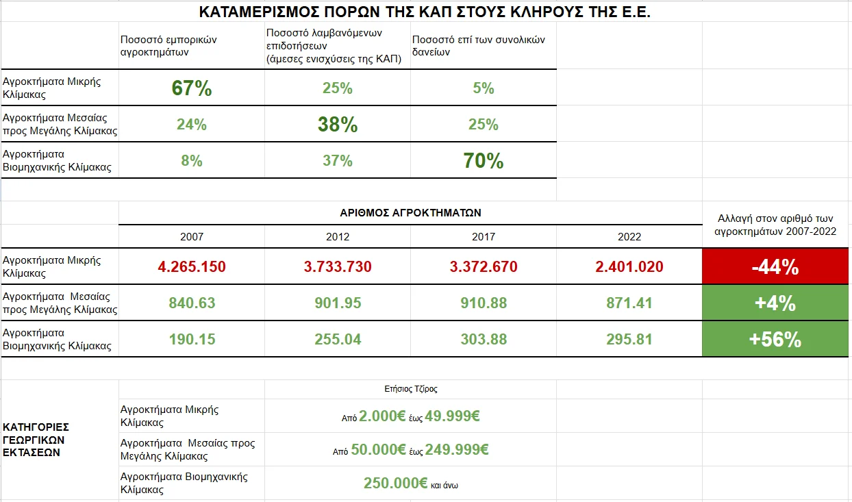 Αν εκατοντάδες χιλιάδες αγροκτηνοτρόφοι (μέσα από τον ΟΠΕΚΕΠΕ που αυτούσιος κρύφτηκε στην ΑΑΔΕ) μοιράζονται περίπου 3 δις ενισχύσεων που τους κρατούν οριακά και μειώνονται δραστικά μέσω της Κ.Α.Π. πόσες δεκάδες δις εισπράττουν με το νόμο του ισχυρού μέσω ΕΣΠΑ – ταμείου ανάκαμψης, λίγες δεκάδες όμιλοι και μεγάλες επιχειρήσεις; Και πως ανεβαίνει θεαματικά η κερδοφορία των τελευταίων αν όχι μέσα από τη στυγνή εκμετάλλευση των εργαζομένων με 13ωρα, συχνά θανάσιμη εντατικοποίηση και μισθούς ανέχειας και πείνας. Όπως κεφάλαιο, κυβέρνηση, Ε.Ε. θεωρούν σπατάλες τις δαπάνες για νοσοκομεία, άλλο τόσο θεωρούν σπατάλες τις ενισχύσεις – αποζημιώσεις των αγροκτηνοτρόφων που πασχίζουν για την επιβίωσή τους.